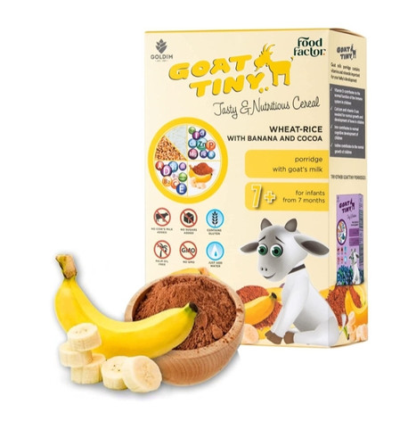 غذای کمکی(فرنی)غلات برنج و گندم با شیر بز +7ماه با طعم موز و کاکائوی ۲۲۵گرم گات تاینیGoat tinyناموجود