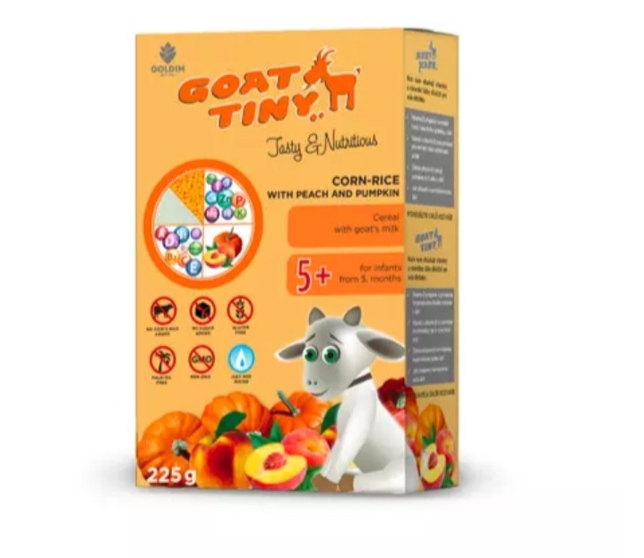 غذای کمکی(فرنی)غلات برنج و ذرت با شیر بز +5ماه با طعم هلو وکدو حلوایی ۲۲۵گرم گات تاینیGoat tiny