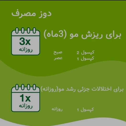 - برای اختلالهای جزئی رشد مو: روزانه 1 عدد کپسول در صبح مصرف شود.