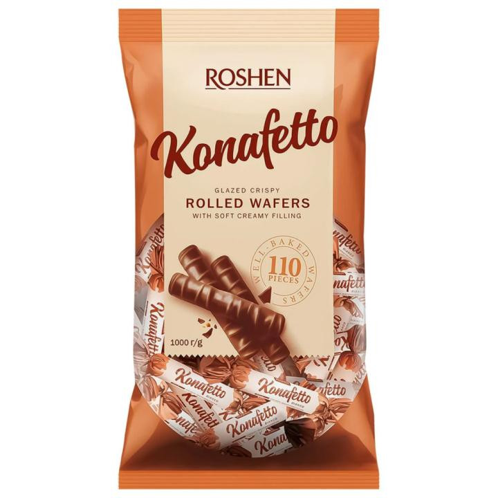 شکلات ویفر رولی با مغز کرم شیری و روکش شکلاتی کنافتتو بیانکو روشن KONAFETTO bianco Roshen