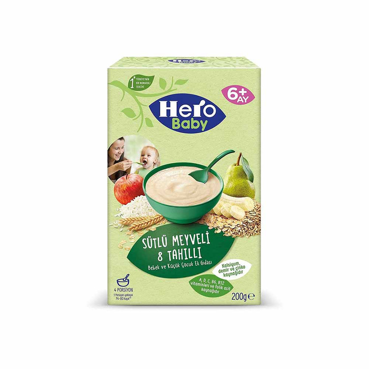 غذای کمکی هشت غله با گلابی، موز، سیب و شیر هرو بیبی | حجم ۲۰۰ گرم