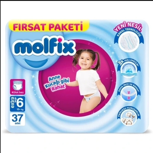 پوشک کودک شورتی مولفیکس ترکیه سایز6 بسته 37عددی Molfix Turkish baby diapers size6 37pcs